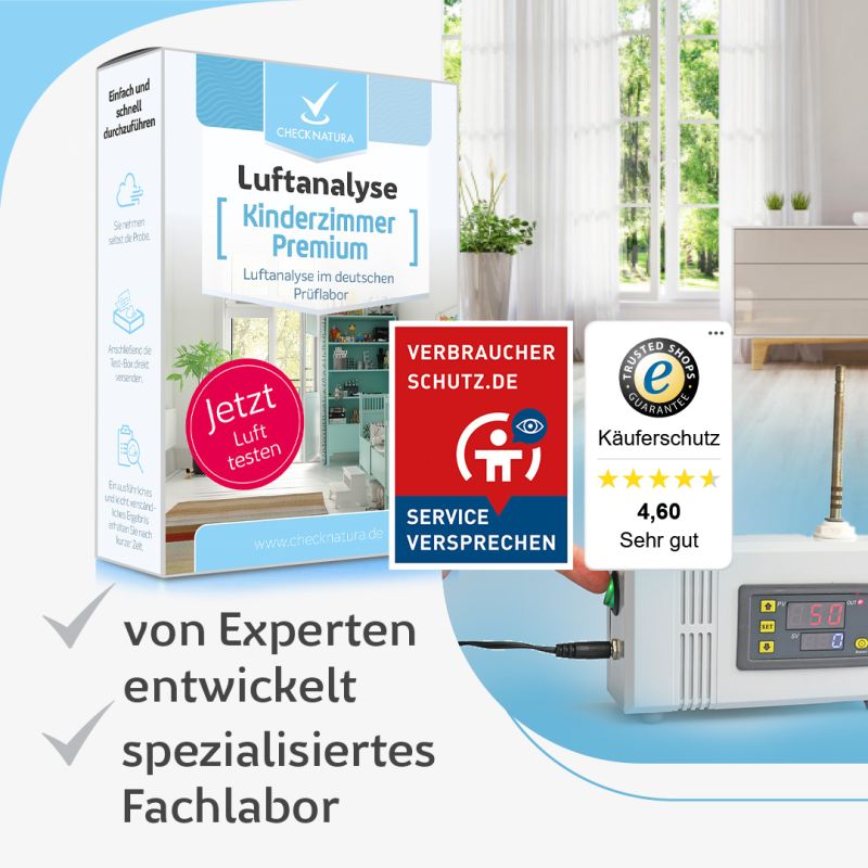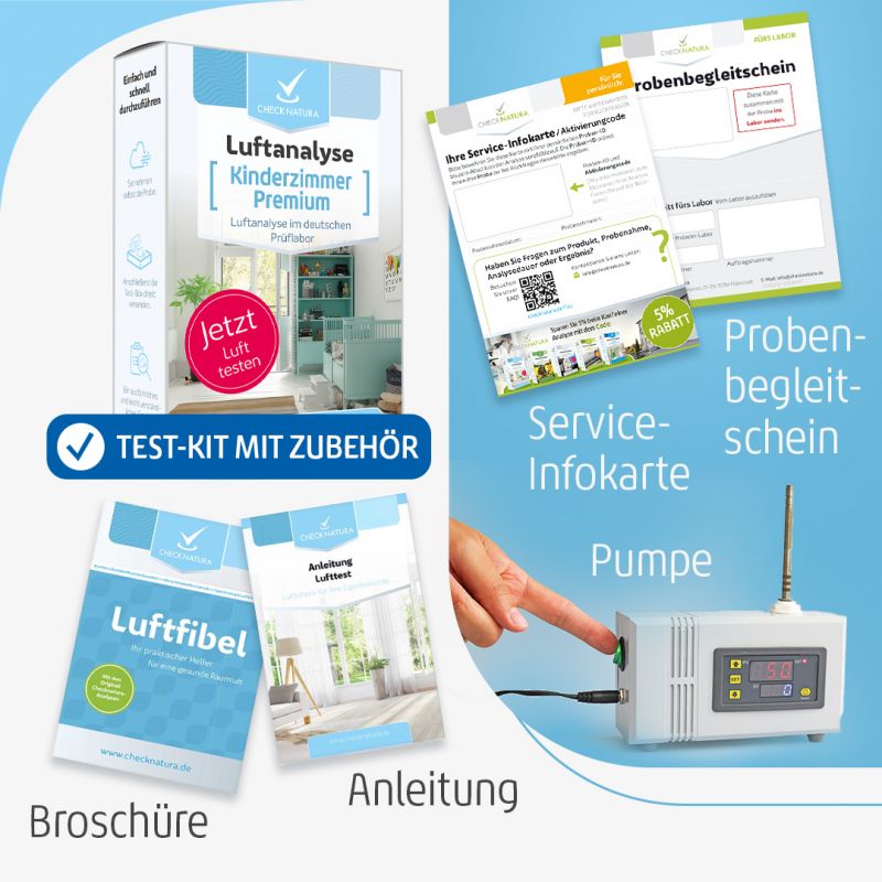 Dieser Test untersucht die Luft in Ihrem Kinderzimmer auf 65 Untersuchungswerte. Die Auswahl der Parameter beim Lufttest Kinderzimmer Premium sowie die Bewertung der Messergebnisse erfolgt anhand von Empfehlungen des Umweltbundesamtes. Der Lufttest kann Ihnen helfen, leichtflüchtige organische Verbindungen in der Luft des Kinderzimmers ausfindig zu machen und deren Quelle zu finden. So schützen Sie Ihr Kind vor gesundheitsgefährlichem Schadstoffeinfluss.
