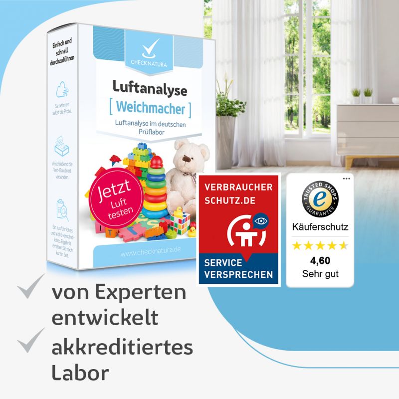 - Aufgrund der professionellen Analyse im Labor können Sie mit einem aussagekräftigen Ergebnis zur Konzentration an Weichmachern rechnen. Sie erhalten ein aussagekräftiges und fundiertes Ergebnis in Ihrem geschützten Kundenbereich MyChecknatura.